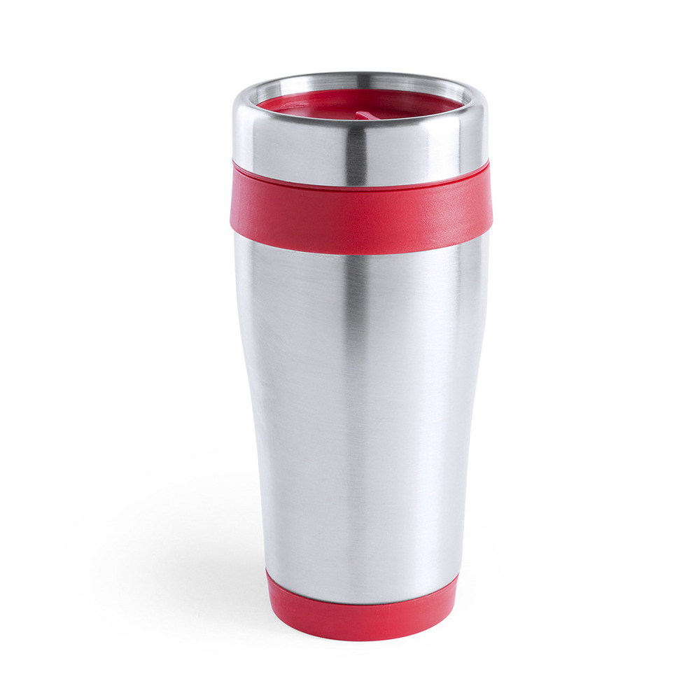 Warmhoudbeker/isoleer koffiebeker in de kleur zilver en metallic rood. Roestvrijstalen isoleerbeker/thermosbeker met een inhoud van 450 ml. Met dubbele wand voor een beter en langer behoud van de temperatuur van de vloeistof. Beveiligingsdeksel en zachte schuimrubberen bodem. Voor koffie, thee en warme drankjes. Reisbekers. Formaat: 18 x 8.6 cm.